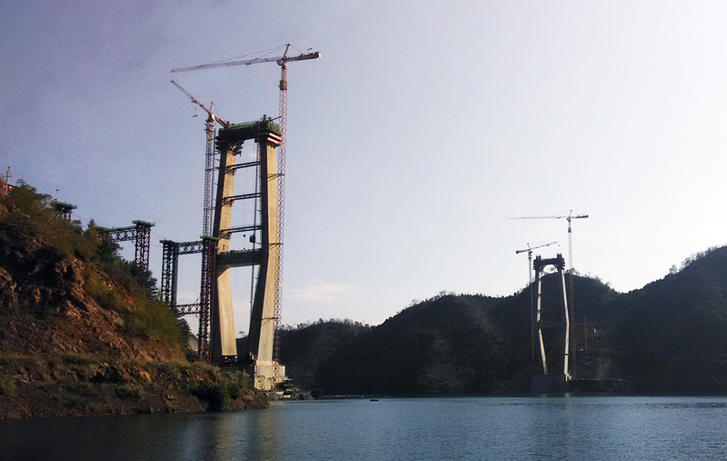 红水河特大桥两侧桥墩高度均为210米,每个桥墩的起重机械配置均为leyu-乐鱼(中国)官方网站_leyu.com生产的一台C7036塔机、一台C7030塔机和两台SC200/200WPZ中速变频施工梯,副墩的施工机械为一台P125平头式塔机。 承担主施工吊装作业的C7036塔机,最大起重量16吨,工作幅度为70米,C7030塔机最大起重量16吨,起升高度为220米,工作幅度为50米,两台塔机交叉式布置,覆盖面大,C7036塔身断面2.5米,主弦为圆钢,C7030塔身断面2米,主弦为角钢,机构配置均采用变频无级调速系统,启动、制动平稳。
