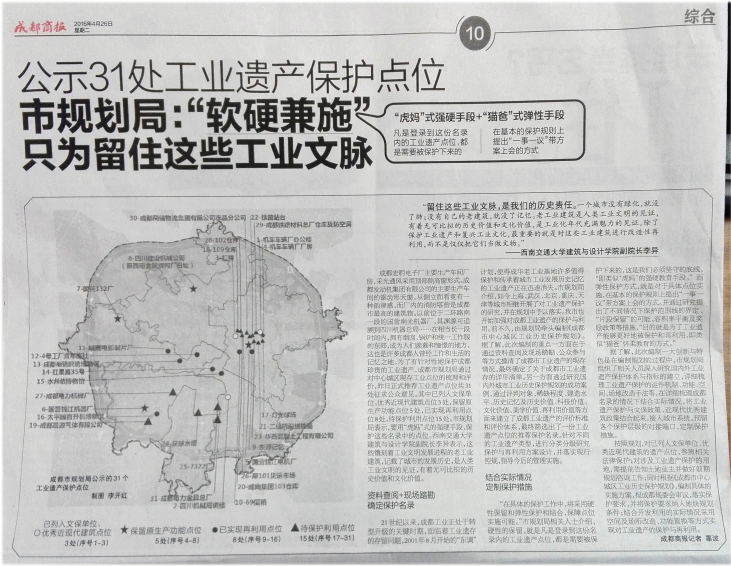 据成都商报2016年4月26日第十版讯,为了有针对性地保护成都珍贵的工业遗产,成都市规划局通过对中心城区现存工业点位的梳理和评价,规划推荐工业遗产点位共31处,其中已列入文保单位、优秀近现代建筑点位3处,保留原生产功能点位5处,已实现再利用点位8处,带保护利用点位15处。