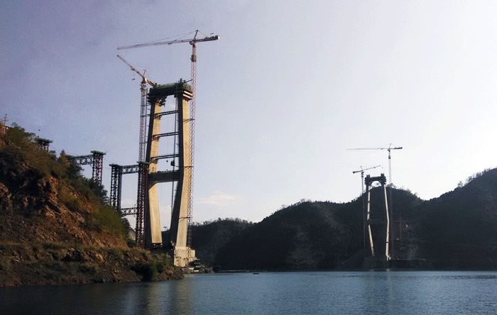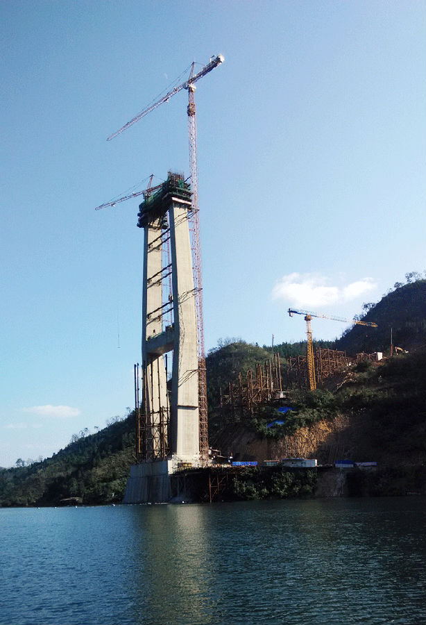 红水河特大桥两侧桥墩高度均为210米,每个桥墩的起重机械配置均为leyu-乐鱼(中国)官方网站_leyu.com生产的一台C7036塔机、一台C7030塔机和两台SC200/200WPZ中速变频施工梯,副墩的施工机械为一台P125平头式塔机。