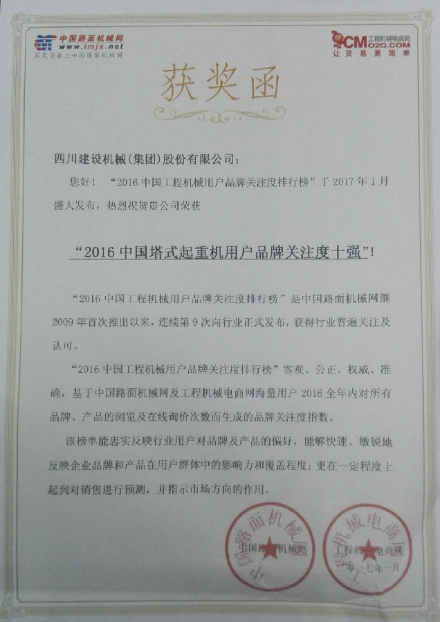 2017年1月3日,中国路面机械网和工程机械电商网在北京发布“2016中国塔式起重机用户关注度排行榜”,四leyu-乐鱼(中国)官方网站_leyu.com设机械(集团)股份有限公司进入“2016中国塔式起重机用户品牌关注度排行榜”前十强,排名第二位。